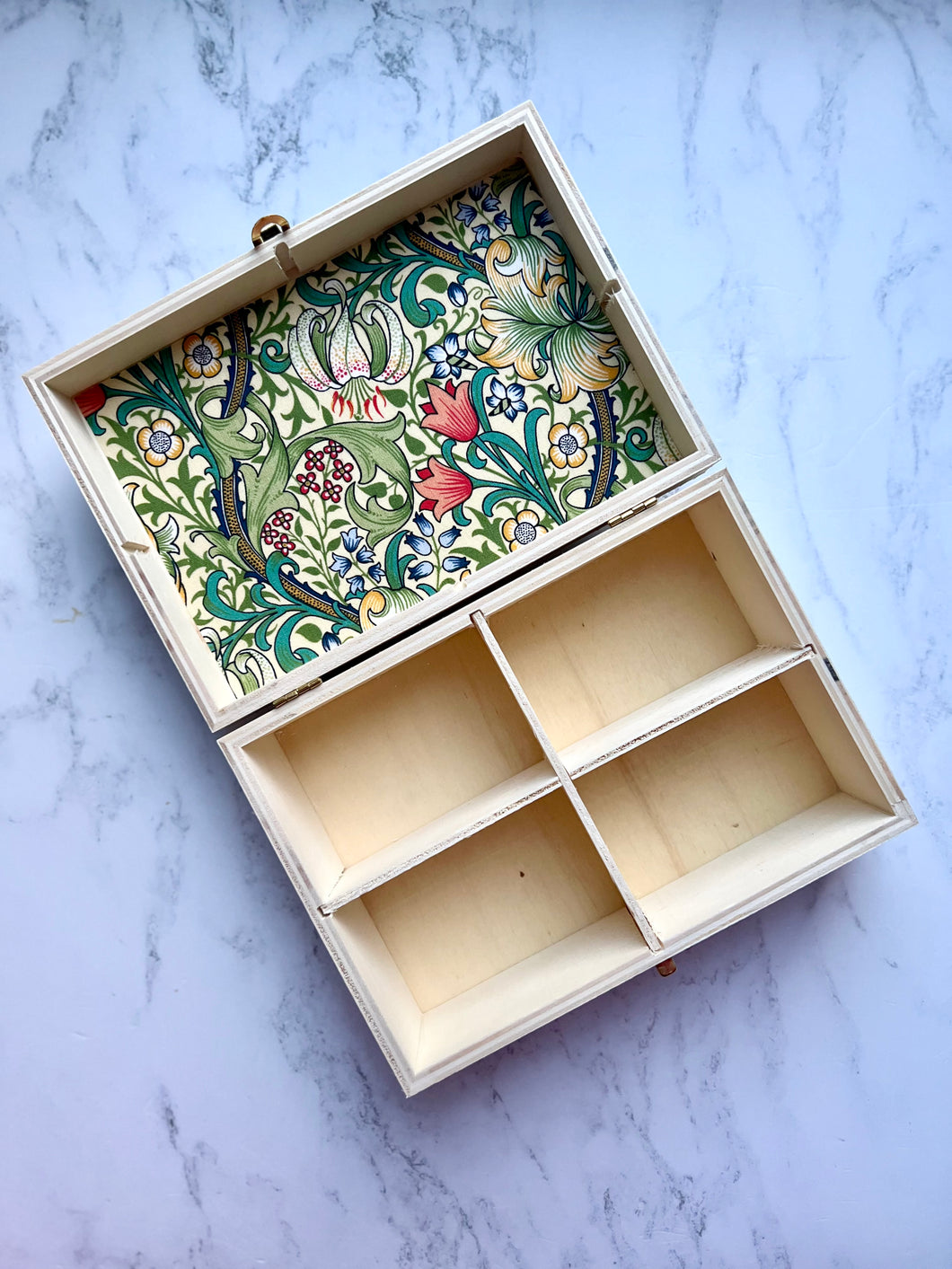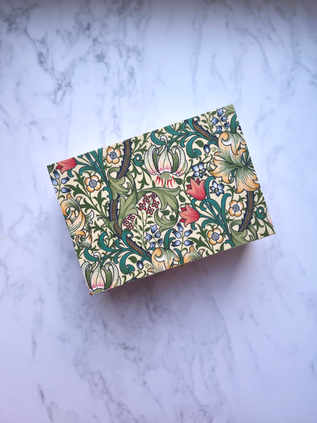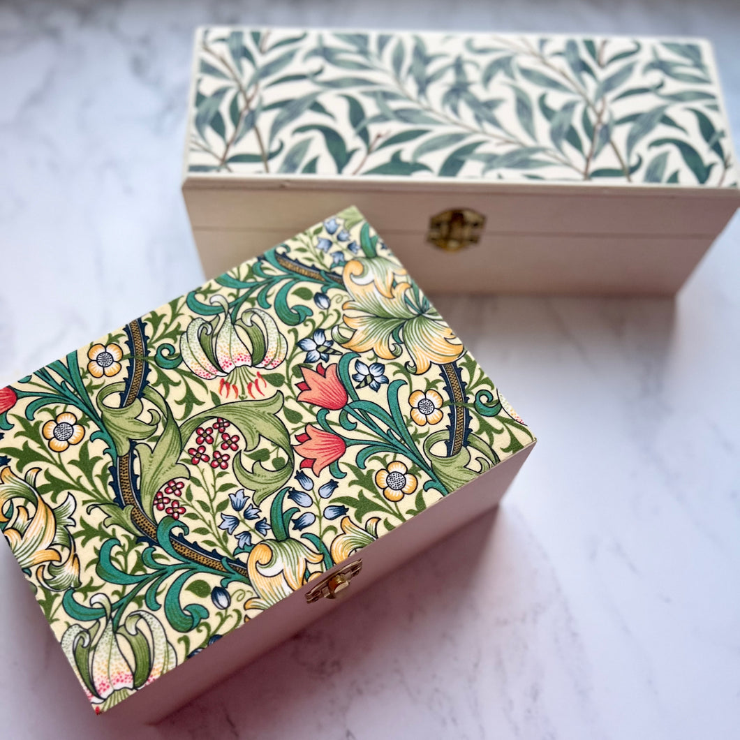 The top and inside of the lid is covered with William Morris design of your choice, with a matt varnish finish.