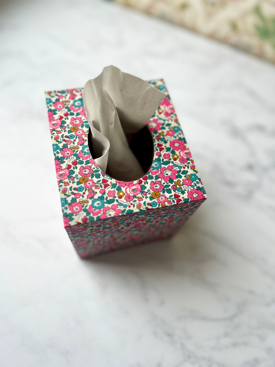 Cotton Fabric is applied carefully by hand, to cover the wooden Box. Then sealed with a satin varnish finish.